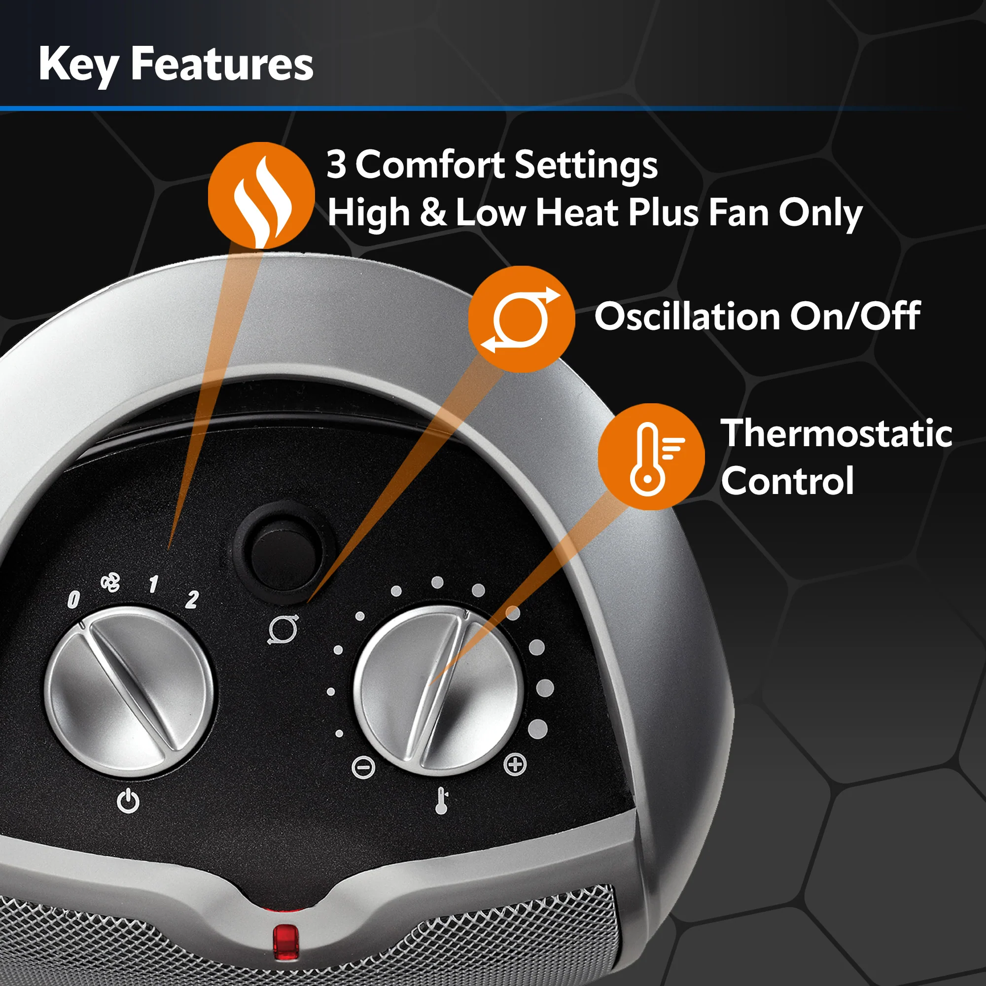 A dependable basic, this oscillating ceramic space heater provides 1500 watts of comforting warmth. Features top-mounted manual controls with 2 quiet heat modes, a fan only mode and an adjustable thermostat. Widespread oscillation evenly distributes a comforting warmth around the room. The convenient carry handle and lightweight design make it easy to move from room-to-room in your home. This compact electric space heater can be use on a table top or floor and is perfect for the bedroom, living room or home office. Built-in safety features include overheat protection, a safe ceramic element and a cool-touch exterior. Comes fully assembled with a 3-year warranty. Condition: New